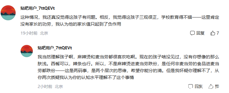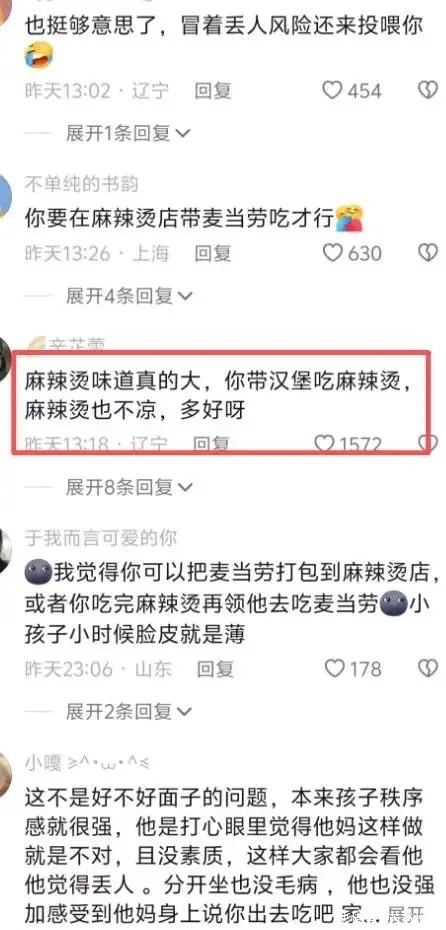 原来,儿子是嫌弃妈妈,在麦当劳的店里,自己带了吃的进来。而且,带的还是麻辣烫。虽然麦当劳可以自己带吃的。